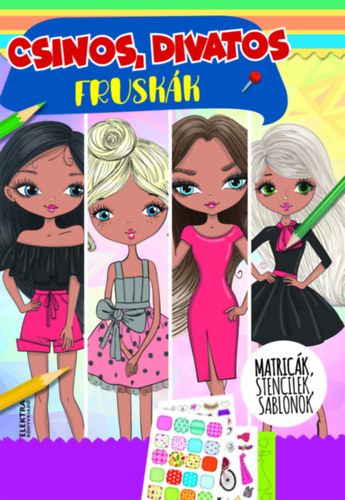 36 oldalas foglalkoztató kislányok számára, mely 1-1 oldal stencilt, öltöztető mintákat, matricát és fóliás matricát is tartalmaz.