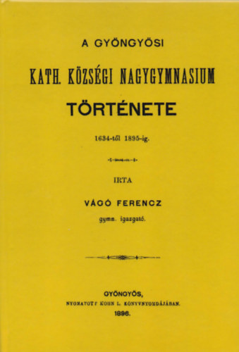 A gyöngyösi katolikus gimnáziumot 1634-es alapításától egészen 1798-ig a jezsuita rend tartotta fenn. Ezt követően a ferences rend vette át, majd 1895 után állami gimnáziumként működött tovább. A kötetben a gimnázium történetét kísérhetjük végig az egyházi kezelést felölelő időszakban. Vágó Ferencz. Gyöngyös : Kohn L. Kny., 1896.