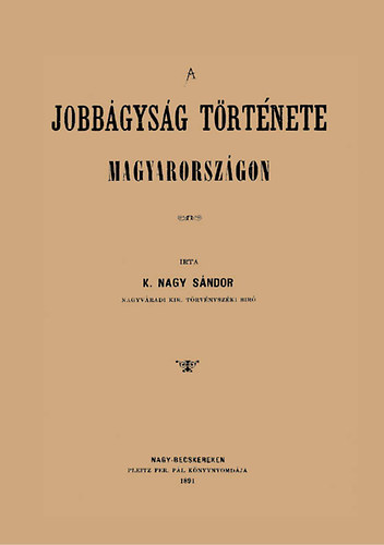 K. Nagy Sándor nagyváradi ügyvéd és törvényszéki bíró számtalan földrajzi és történeti munka szerzője volt. A kötetben a magyarországi jobbágyság történetét tárgyalja, amely a Tört., nép- és földr. Könyvtár sorozat 37. darabjaként jelent meg. irta K. Nagy Sándor ; kiadja Szabó Ferencz. - Nagy-Becskereken : Pleitz Fer. Pál könyvnyomdája, 1891.