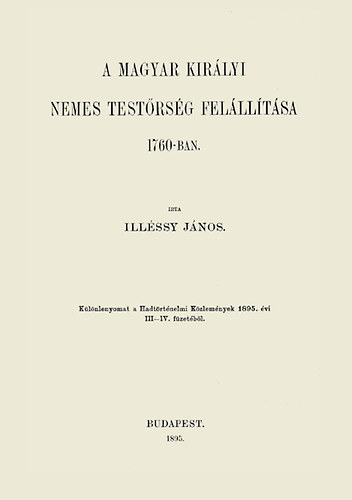 A Magyar Királyi Nemesi Testőrség felállításának gondolata először 1740-ben vetődött fel a magyar országgyűlésen, az ifjú királynő, Mária Terézia védelmében. A magyar nemesi ifjakból álló testület toborzása végül 1760-ban kezdődött meg. A gárdába Magyarország 96, Horvátország és Szlavónia 4, Erdély pedig 20 nemest küldhetett. A testőrség élén négy tiszt, a kapitány, alkapitány, főhadnagy és alhadnagy állt, akiket az uralkodó személyesen jelölt ki. A jelen kötetben a testőrség felállításának körülményeiről és szervezeti felépítéséről olvashat az érdeklődő. írta Illésy János. – Budapest : [s.n.], 1895. Klny. a Hadtörténelmi Közlemények 1895. évi III. (p.367-439.) és IV. (p. 522-554.) füzetéből
