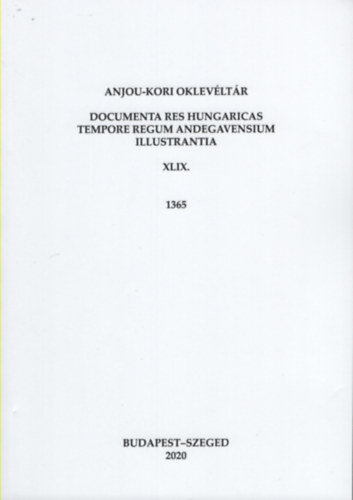 Anjou-kori Oklevéltár XLIX. 1365 E sorozat köteteiben mindazon levéltári források helyet kapnak, amelyek 1301. január 1. és 1387. március 30. között keletkeztek, s az Anjou-kori Magyarország területére vonatkoznak. A kötetek minden egyes okmányt közölnek - jobbára regeszta formájában -, függetlenül attól, hogy már megjelent nyomtatásban vagy sem. A regeszták nyelve magyar, bizonyos szakkifejezések és a keltezésre vonatkozó rész az irat eredeti nyelvén szerepelnek. A regeszták az oklevél minden egyes személy- és helynevét tartalmazzák, amennyiben azoknak magyarországi vonatkozásuk van. A kötetek mindegyikét mutató zárja.