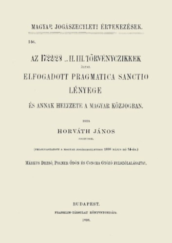 Horváth János: Az 1722/23. I. II. III. törvénycikkek által elfogadott Pragmatica Sanctio lényege és annak helyzete a magyar közjogban (2015)