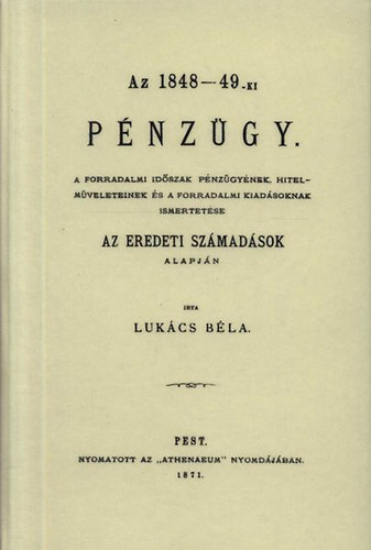 írta Lukács Béla. - Pest : Athenaeum, 1871. Lukács Béla a dualizmus korának pénzügyi szakembere számos gazdaságtörténeti munka szerzője volt. A jelen munkája részletesen ismerteti az 1848/49-es forradalom és szabadságharc pénzügyi oldalát.