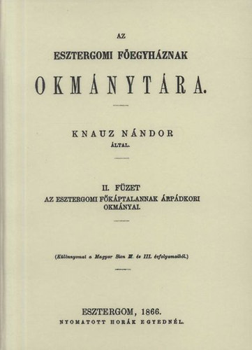 Knauz Nándor által. - Esztergom : nyomtattatott Hornyák Egyednél. Knauz Nándor katolikus pap és történész az esztergomi érseki könyvtár és levéltár kezelőjeként évtizedekig kutatta az érsekség történetét. A kétkötetes okmánytár ennek a munkának az eredménye.