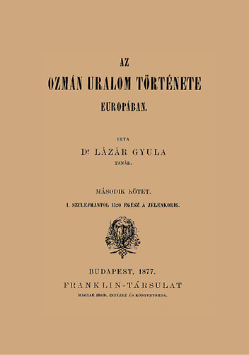 Lázár Gyula tanárként több száz német és magyar nyelvű történeti munka szerzője volt. Kétkötetes tanulmányának második felében I. Szulejmántól egész a jelenkorig dolgozta fel az oszmánok történetét. - Budapest : Franklin, 1877.