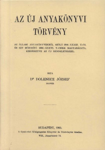 A kötet az 1894-es XXXIII.számú állami anyakönyvi törvényt tárgyalja, amely részletesen szabályozza a születési, házassági és halotti anyakönyvek kiállításának módozatait és az ezzel kapcsolatos büntető határozatokat. írta Dolenecz József.Budapest : Gyak. Közig. K., 1905.