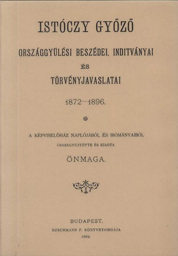 Istóczy Győző a dualizmus korának egyik Vas megyei politikusa, aki 1872-től vett részt az országgyűléseken mint képviselő. A korabeli antiszemita mozgalom egyik legmarkánsabb képviselője, az Országos Antiszemita Párt alapítója. A jelen kötetben saját maga gyűjtötte össze beszédeit. indítványait és törvényjavaslatait. A kötet kordokumentumként szolgálhat az antiszemitizmus hazai kutatásához. - A Képviselőház naplójából és irományaiból összegyűjtotte és kiadta önmaga. Budapest : Buschmann Ny., 1904.