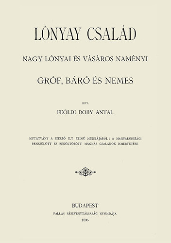 A Lónyay család történetét, amely a 11. századra vezethető vissza, a jelen kötetben egészen a 19. századig végigkíséri a szerző Doby Antal, aki több más főnemesi család történetét is papírra vetette. Feöldi Doby Antal. – Budapest : Pallas Ny., 1895.