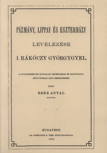 I. Rákóczi György fejedelem (1593-1648) uralkodása alatt a reformáció terjedéséért sokat tett. Levelezése az ellenreformáció vezető alakjainak számító Pázmány Péter, Lippay György esztergomi érsekekkel főként vallási, egyházi kérdésekkel foglalkozik, amíg Esterházy Miklós nádorral főként politikai kérdésekről cseréltek véleményt. Beke Antal. Budapest : Athenaeum Rt. Kny., 1882.