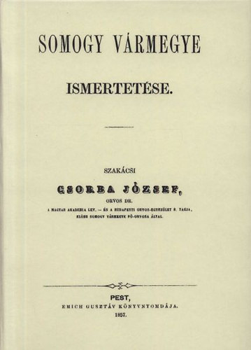 Csorba József Somogy megye főorvosa a szerzője a jelen munkának. Az eredetileg 1857-ben megjelent mű Somogy vármegye történeti, földrajzi és természeti viszonyainak leírása. Hasonmás kiadás.