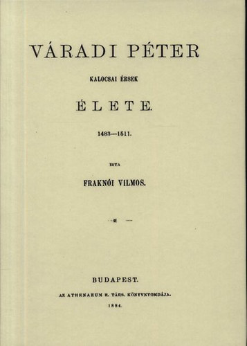 Fraknói Vilmos. -Budapest : Athenaeum Ny., 1884. Hasonmás kiadás. Váradi Péter humanista érsek elsősorban levelezése miatt vált ismertté. Vitéz János esztergomi érsek neveltje a bolognai egyetemen tanult. Hazatérve Mátyás király udvarába, majd pedig a kalocsai érsekség élére került. Élettörténetét a váradi kanonok, Fraknói Vilmos dolgozta fel.