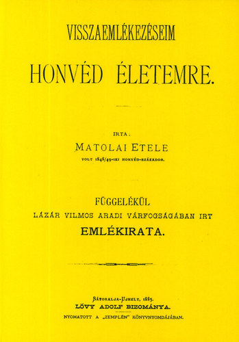 irta Matolai Etele [Sátoraljaújhely] Sátoralja-Ujhely : Lővy Adolf bizománya, 1883. A jelen munka Matolay Etele hosszú életű zempléni alispán, történetíró visszaemlékezései az 1848/49-es szabadságharcra, amelyet honvéd századosként élt végig.
